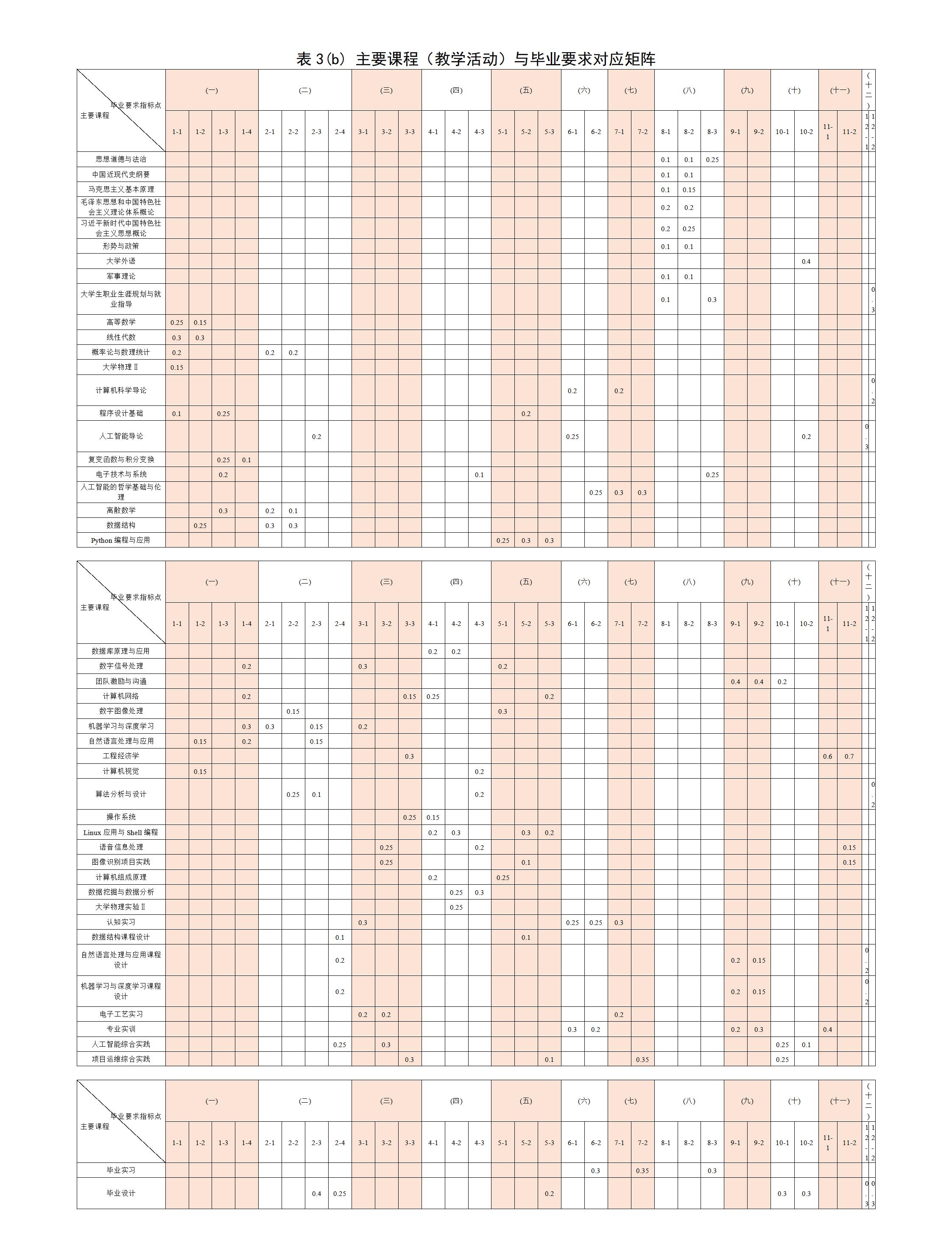 主要课程:高等数学、线性代数、概率论与数理统计、计算机科学导论、复变函数与积分变换、人工智能导论、程序设计基础、大学物理、电子技术与系统、离散数学、数据结构、计算机网络、人工智能的哲学基础与伦理、数据库原理与应用、Python编程与应用、数字信号处理、数字图像处理、机器学习与深度学习、自然语言处理与应用、团队激励与沟通、工程经济学、计算机视觉、人工智能综合实践、项目运维综合实践等。