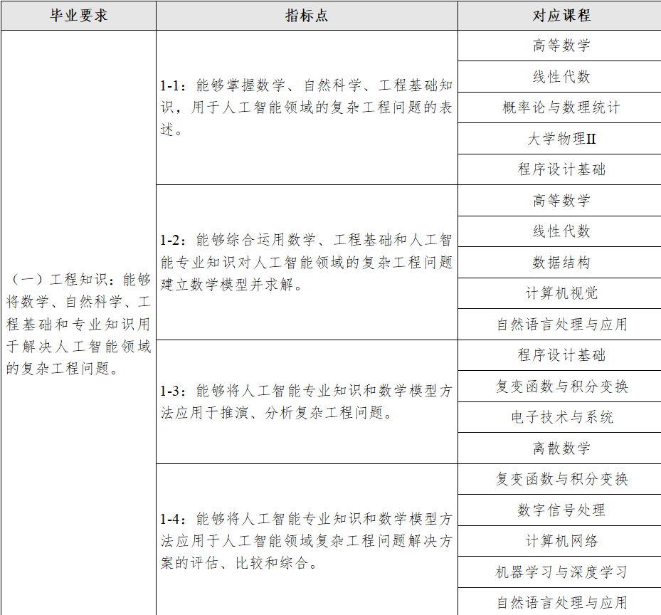 1.工程知识:能够将数学、自然科学、工程基础和专业知识用于解决人工智能领域的复杂工程问题。