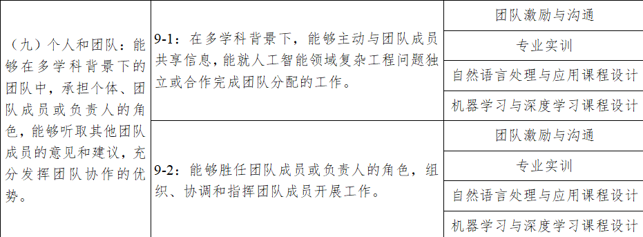 9-1:在多学科背景下,能够主动与团队成员共享信息,能就人工智能领域复杂工程问题独立或合作完成团队分配的工作。