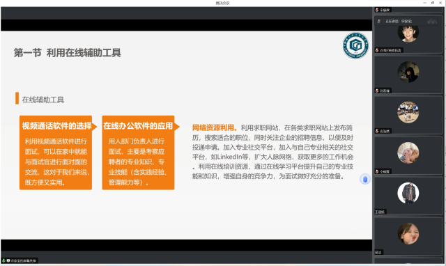 讲座中,主讲人宗家宝从专业知识和面试经历出发,结合理论和实践,从疫情影响下的就业形势、面试技巧的基础要点、远程面试的准备与应对、政策支持与社会资源四个方面为同学们详尽全面的讲解了求职面试礼仪与技巧。首先,宗家宝从疫情下企业招聘压力、线上求职成为主流、特殊群体就业困难增加三方面详细讲解了疫情大环境下就业求职面试的劣势弊端和困难挑战,鼓励大家可以正式环境压力,努力争取心仪的就业岗位。其次,宗家宝重点分析了突出自身优势、展示适应能力、表达积极态度三个面试礼仪和技巧,特别强调了面试结束时也要注意主动告辞、表示感谢等礼仪。最后,宗家宝向同学们展示了利用在线辅助工具和远程面试设备检查的技巧以准备和应对远程面试,并分享求职网站和远程面试设备检查应用以做到对远程面试的充分了解。会议结束后,与会同学纷纷表示对远程面试有了进一步的了解,掌握了面试礼仪与技巧,为以后的就业求职奠定了基础。