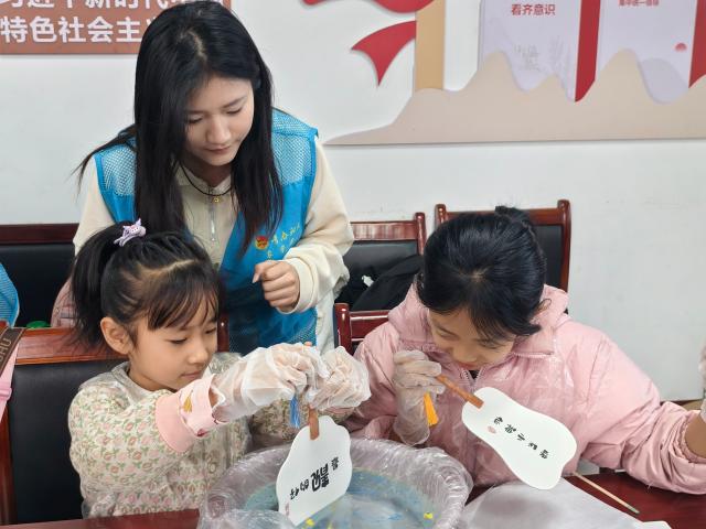 活动开始前,志愿者为社区儿童分发提前准备好的扎染所需的材料,包括白色扇子、染料、水盆、手套等,向他们详细介绍了漆扇的历史和文化底蕴,激起大家对于漆扇的兴趣。活动过程中,志愿者亲身示范,让他们直观地了解漆扇的制作工艺,提高对传统文化的认识和保护意识。随后,志愿者与现场儿童就扎染的图案展开了问答互动,在一片欢声笑语中,扎染手工体验活动正式开始,随后小朋友们纷纷加入到漆扇制作行列。先挑选自己喜欢的颜色滴入水中,用竹签画出自己满意的图型;再将团扇缓缓放入水中上色,拿出水面就会呈现出一幅美丽的画卷,五颜六色的漆扇让小朋友们非常惊喜,每个人都在与非遗文化的邂逅中收获了一份专属于自己的非遗礼物。活动最后,孩子们积极展示自己的作品,志愿者与他们一起合影留念,为今天的活动画下一个圆满的句号。