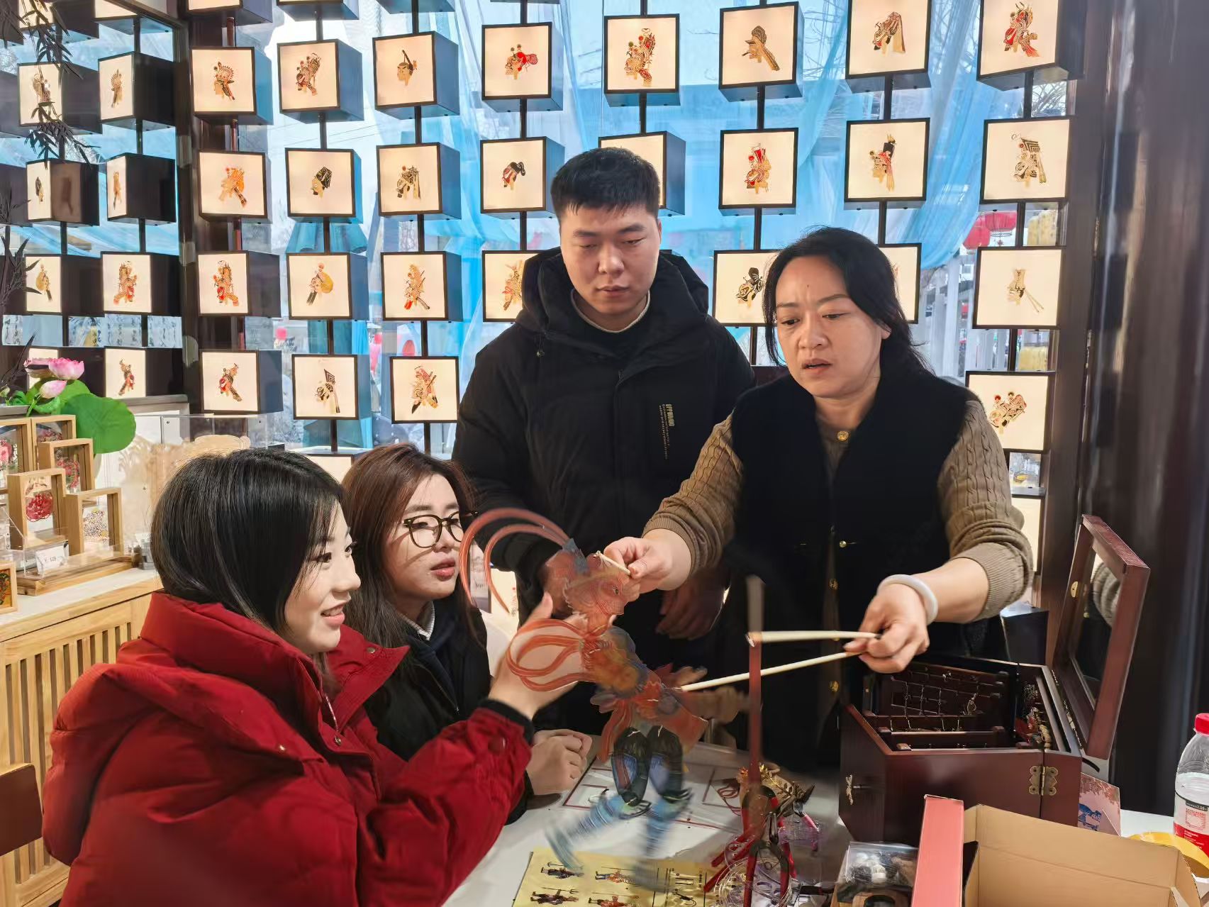 创新传承,影绘新生。团队成员前往济南皮影青年之家,聆听济南皮影戏传承人深入浅出地讲解济南皮影戏的历史渊源、艺术特色等相关知识,观看《武松打虎》《孙悟空大战蝎子精》等经典剧目表演。在观影过程中,与传统印象中的皮影戏不同,团队成员能明显感受到济南皮影戏的独特之处,它巧妙融入现代化元素和笑料,经典故事结合当下热点,以幽默诙谐的语言被讲述,让人忍俊不禁,唱腔里也偶有现代音乐的韵律,使古老艺术得到焕新。这种现代化的创新让古老的皮影戏带来别样的观赏体验,既保留传统韵味,又符合当代各年龄段观众的喜好。在讲解期间,团队成员从游戏《黑神话︰悟空》中提出应如何看待科技带领非遗传承的问题,传承人表示,在当今科技创新的时代浪潮下,皮影戏艺术确实需要与时俱进,但前提是牢牢坚守其文化根本,只有在稳固根基的基础上合理创新,才能既让皮影戏贴合现代观众的审美需求,又不失其独特的艺术价值与文化内涵,实现传统文化的可持续传承与发展。在讲解与表演结束后,传承人现场传授皮影操纵技巧。团队成员认真聆听、仔细观察,纷纷亲自上台尝试,演绎一段段精彩小故事。在实践过程中,大家切实感受到济南皮影操纵的乐趣与挑战,也对济南皮影戏这一古老非遗艺术有了更为深刻的感悟与认知。