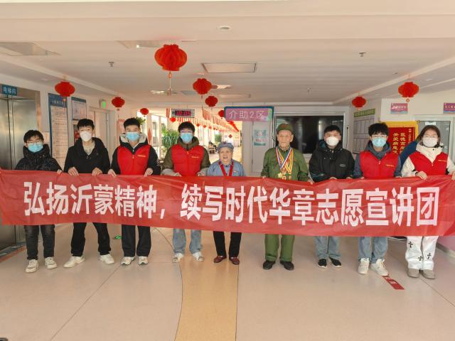 1月23日,志愿者来到沂南县天河医院看望抗战老兵、老党员并对他们进行采访。活动伊始,志愿者成员带着关怀与敬佩地将牛奶、水果等分发给老人,对他们表达亲切问候。主要采访的有参加过鲁南战役、莱芜战役、孟良崮战役以及淮海战役,并被授予“爆破英雄”光荣称号的朱有芹和老党员李淑元。通过聆听朱有芹和李淑元两位老人讲述参与战役时印象深刻的故事、新中国在他们眼中的发展以及他们对现代青年好好学习、爱国爱党的鼓励,志愿者成员看着老人胸前的奖牌,深受鼓舞,顿生敬佩。最后,朱有芹邀请志愿团一同唱起国歌,李淑元表演沂蒙山小调。在歌声中,志愿者看到了沂蒙人的铮铮铁骨,沂蒙精神的振奋人心以及祖国的繁荣昌盛。志愿者成员纷纷表示,将不负两位老人的殷切期盼,好好学习,把沂蒙精神牢记心中,弘扬沂蒙精神,传承红色文化。