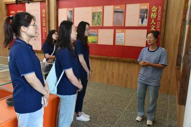 随后,实践队员与黄元桃进行座谈交流。队员们结合所见所感踊跃提问,黄元桃就农旅融合运营、研学资源开发等实际问题作了细致解答,并详细介绍了金桥村学习运用“千万工程”经验的具体做法。她特别谈到,脱贫攻坚期间,全村党员干部群众“不忘初心、牢记使命”,坚持以“党旗红”引领“乡村兴”,通过传承红色基因、讲好遵义故事、弘扬长征精神,不断巩固农村文化根基,绘就出一幅乡风淳朴、乡村美丽、百姓富裕的金桥新画卷。队员们深切体会到基层党员干部带领群众脱贫致富的奉献精神,直观感受到国家乡村振兴政策的实践力量,不仅进一步厚植了家国情怀,也更加坚定了以专业知识服务基层、助力乡村振兴的理想信念。