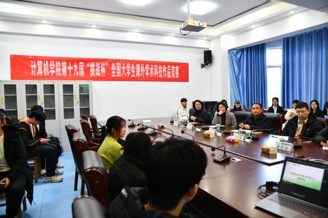 为激发同学们的创新思维与创业能力,提升他们的课外学术科技作品的创新水平。在11月23日,计算机学院在10号楼A408举办了第十九届“挑战杯”全国大学生课外学术科技作品竞赛(院赛)活动。此次活动特邀副院长贾保先及张孟卿、孟磊磊、姜华、邹温强五位老师作为评委。