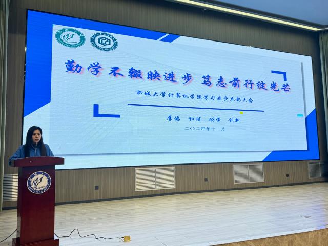活动伊始,张雪宣读本次表彰大会获奖名单,其中共有66名同学获得学习进步奖。大会上,学习进步奖获奖学生代表进行发言,分享了自己在日常学习、生活过程中的心得体会。从克服困难的勇气到坚持不懈的努力,从团队合作的力量到自我超越的喜悦,每一个故事都激励着在场的每一个人。他们的发言,不仅是对过去成绩的回顾,更是对未来挑战的宣誓,展现了计算机学院学子不畏艰难、勇往直前的精神风貌。最后,杨磊发表讲话,他首先对获奖的同学表示热烈的祝贺,并且强调学习进步对于个人成长和学院发展的重要性,鼓励所有学生以受表彰的同学为榜样,不畏艰难,勇于挑战,持续追求卓越。同时在保证学习的前提下,注重身体素质的提升,利用课余时间进行体育锻炼,也要培养、提升个人创新意识和实践能力,实现高质量全面发展。