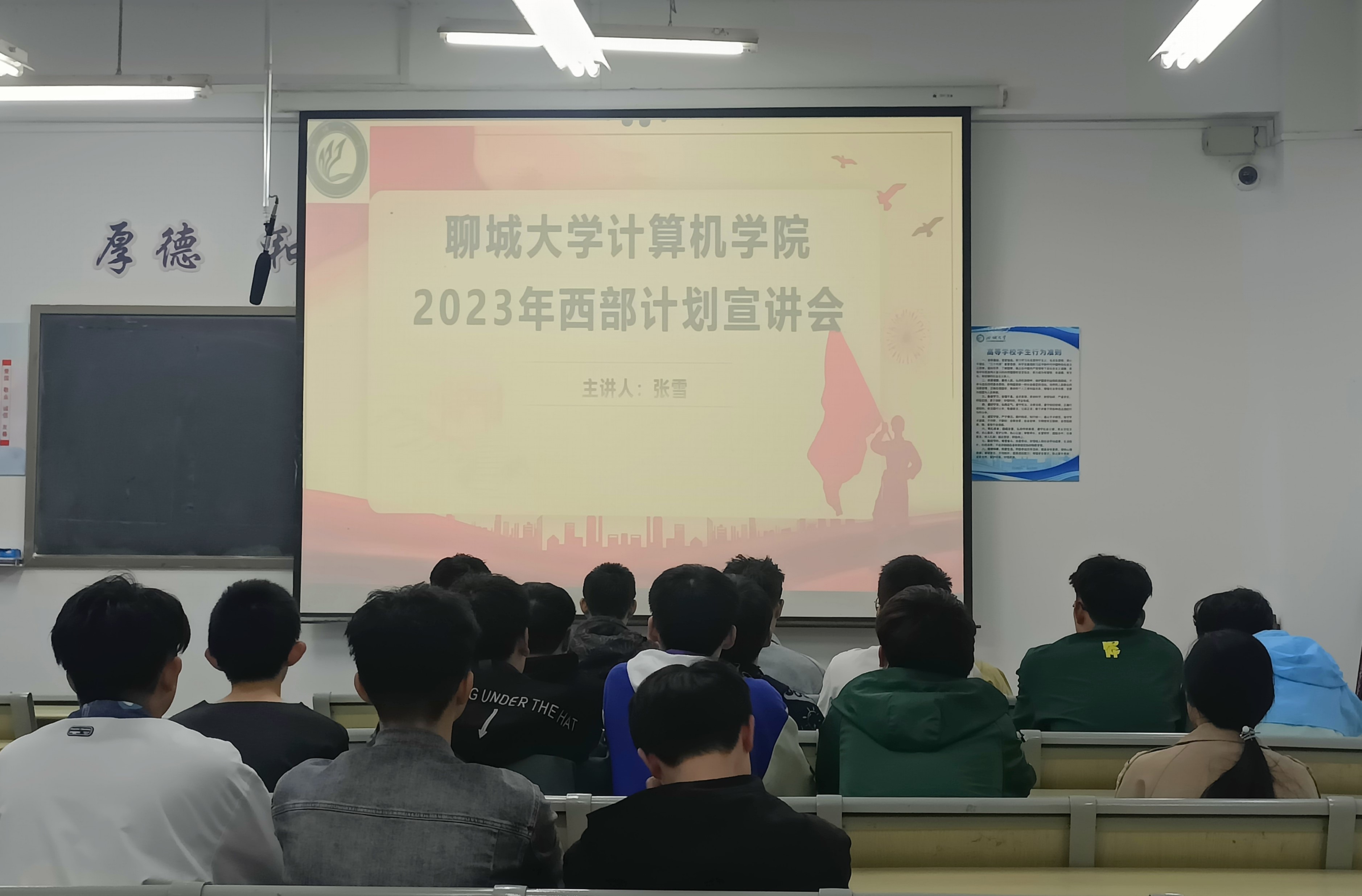 张雪围绕2023年西部计划整体概况、西部计划保障机制、计算机学院开展情况及招募流程等内容进行了详细介绍和解读,同时紧扣“西迁精神”这一主题,讲述了投身边陲小城的莘莘学子的励志志愿故事,号召更多青年学子们加入,实现自我价值。青春不以山海为远,志愿只向家国未来。在答疑环节中,同学们根据此次宣讲会内容提出了自己感兴趣的问题,张雪对志愿服务工作内容、工作地点以及未来发展等方面的问题做出了针对性的解答,还向同学们介绍了计划志愿者招募的相关政策,鼓励同学们投身西部,奉献自己,让自己在志愿服务中成长,在广阔的平台上为祖国西部的建设以及西部的发展做出贡献。宣讲会后,同学们纷纷表示,奋斗正青春,青春献给党,应积极响应国家号召,实现自我价值,让青春的列车,向西驶去,到祖国和人民最需要的地方,让青春之花在祖国的大西北不断绽放!