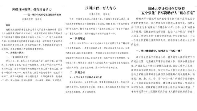 学生资助工作是维护教育公平、促进社会和谐的关键举措,对于推动教育脱贫攻坚、实现社会整体进步具有深远意义。2024年,计算机学院秉持发展型资助的核心理念,将“扶志”与“扶智”紧密结合于资助育人的全过程,致力于构建精准资助的标准化体系与长效育人的综合机制,推动资助工作向更高质量、更深层次发展。展望未来,计算机学院将继续深化资助育人内涵,拓宽资助渠道,强化资助效果评估,努力构建更加完善、更加高效的资助工作体系,为培养德智体美劳全面发展的社会主义建设者和接班人贡献力量。今年,计算机学院完成了三篇资助案例的编写和报送,完成资助论文两篇,徐培文撰写的《理工类退役复学大学生资助育人工作研究》被《北大荒文化》杂志,范飞越撰写的《基于大数据技术的高校资助育人效果评估与优化研究》被《探索科学》杂志录用录用,成果斐然。