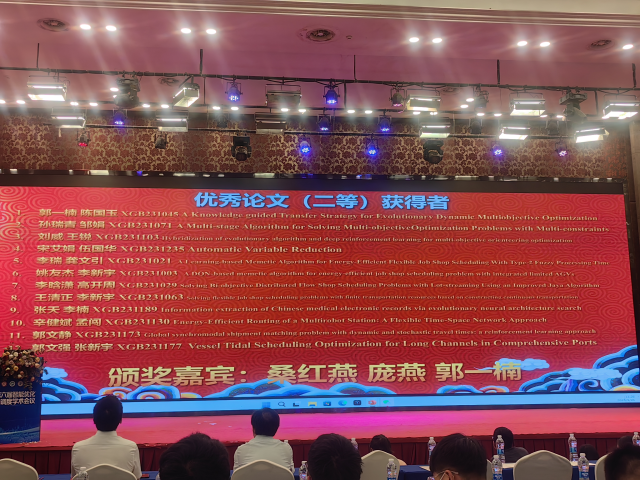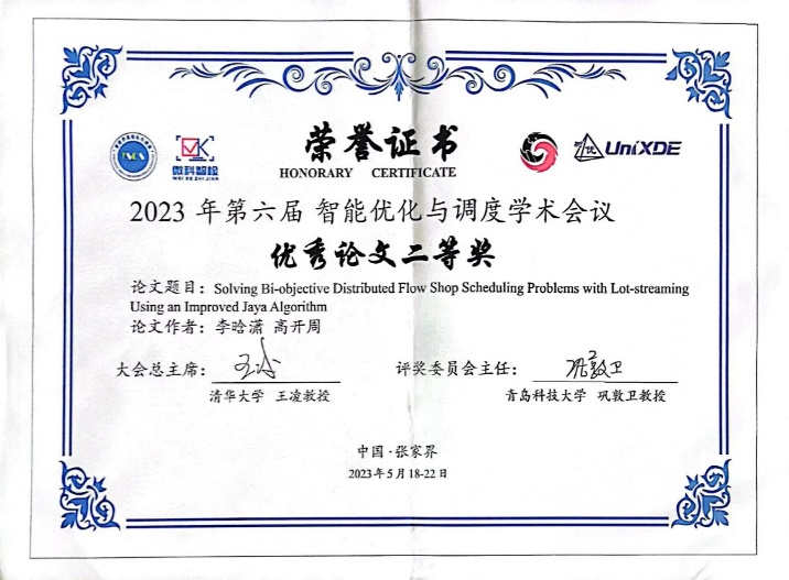 近日,樱花动漫 高开周老师课题组最新研究成果《An Improved Artificial Bee Colony Algorithm with Q-learning for Solving Permutation Flow-shop Scheduling Problems》获得第六届智能优化与调度学术会议优秀论文二等奖。该论文第一作者为樱花动漫 2020级硕士研究生李晗潇,指导老师为高开周博士。樱花动漫 桑红燕教授作为颁奖嘉宾之一,为获奖者颁奖。