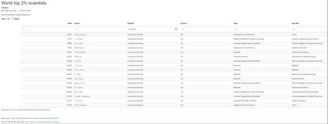 近日,美国斯坦福大学John P.A.Ioannidis教授团队和爱思唯尔数据库联合发布了第六版《2022年全球前2%顶尖科学家榜单》。榜单以Scopus数据库为依据,基于学者论文引用次数、H因子等6种指标,从22个领域和176个子领域近700万名科学家中遴选出世界排名前2%的科学家,目前在国际上尤其是学术界有较大影响力。